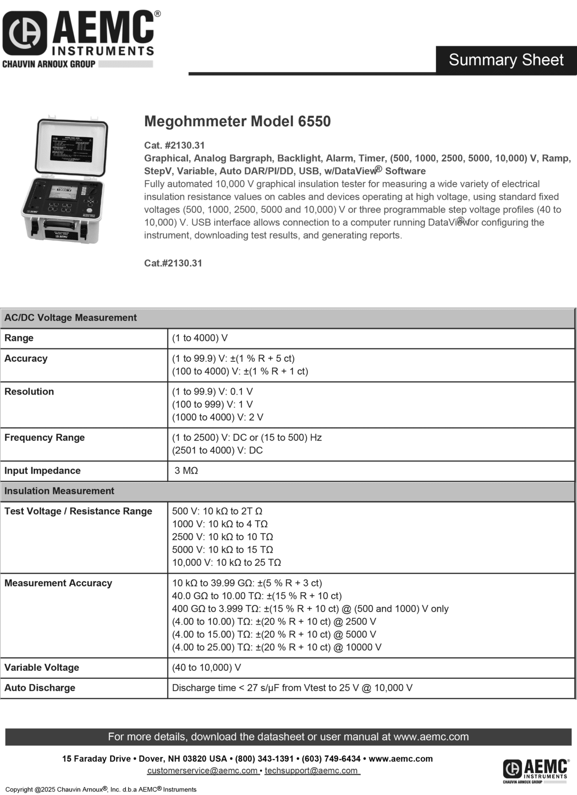 The Megohmmeter Model 6550 is a high-end portable measuring instrument intended for the measurement of a wide variety of electrical insulation resistance values on cables and devices operating at high voltage. It is the only fully automated 10,000 V graphical insulation tester. The True Megohmmeter® Model 6550 is packaged in a rugged case that is IP65 when closed. Test results and configuration information are displayed on a graphical LCD screen, and are exportable via DataView® (provided). This megohmmeter can operate on battery or AC power.