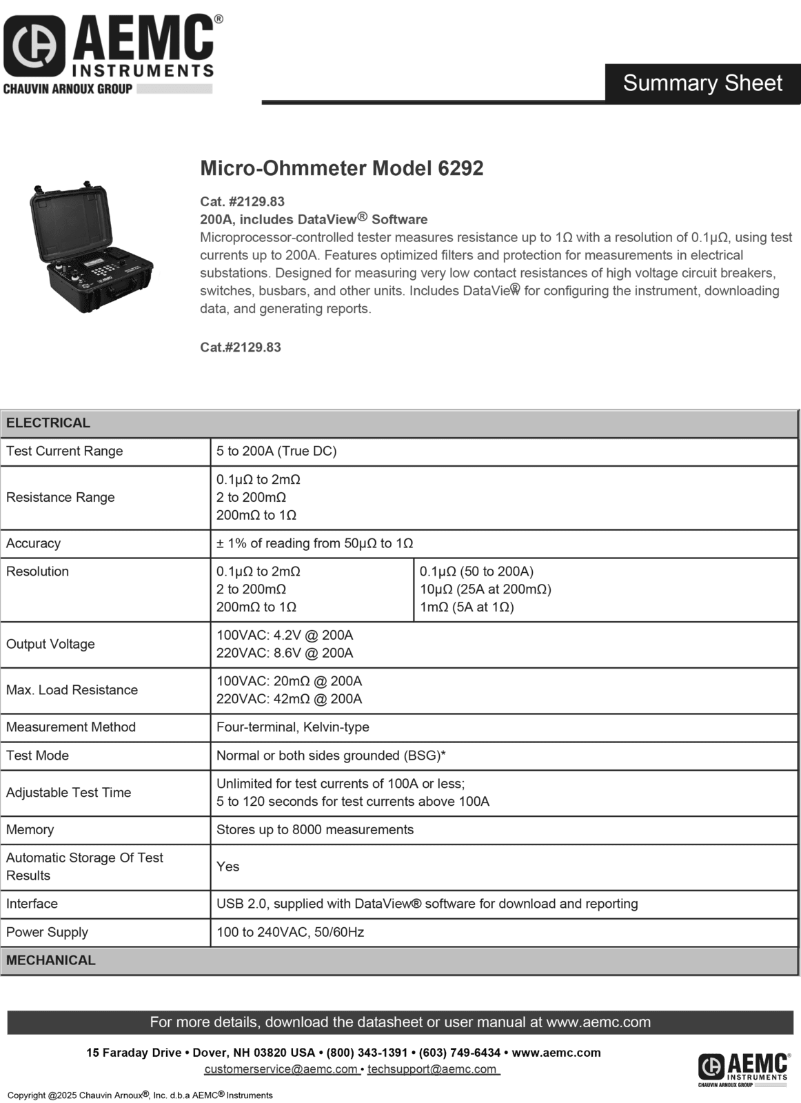 The high-current Micro-Ohmmeter Model 6292 is a portable, microprocessor-controlled instrument. It has optimized filters and protection for measurements in electrical substations. The Model 6292 can be used to accurately measure very low contact resistances of high voltage circuit breakers, switches, busbars, etc., with test currents up to 200A.