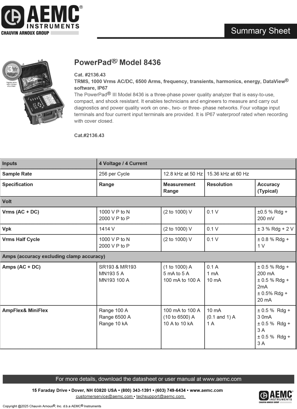 The PowerPad® III Model 8436 is a three-phase power quality analyzer that is easy-to-use, compact and shock resistant. It enables technicians and engineers to measure and carry out diagnostics and power quality work on one-, two- or three- phase networks. Five voltage and four current inputs are provided. It is IEC 61000-4-30 Class B and safety rated to 600 V CAT IV. It is rated IP67 when used with the flexible sensor Ampflex® 196 A.